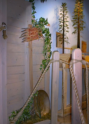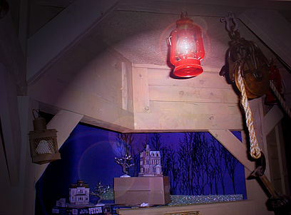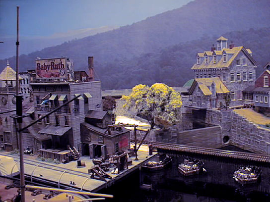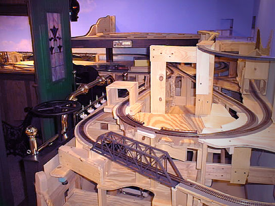 In this view taken from the passenger's suspension bridge leading to the tunnel entrance of the Blood Sweat &Tears mine, we see the bridge work across the top of the falls, in the foreground. The water will fall all the way to the floor next to you (and pass beneath the bridge you are standing on!). The greater Squaw Bottom area occupies the space behind that (across the vestibule), and that's Genesis peaking out from the upper tier in the distance. The GFL engine facilities are just visible below Genesis, and through the coach window. This section of the layout is 'next'... The shot above is likely as close to an 'overall pike perspective shot' as you will find anywhere in the GFL! Approximately 20% of the 'Serpent's Tongue Route' track work is visible here. |